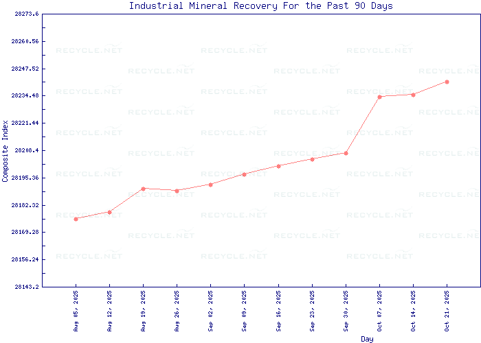 The Industrial Mineral Recovery Composite Index tracks the changing market prices if recovered minerals . The Index consists of a weighted basket of specific benchmark grades of recovered minerals and scrap industrial materials . The Index includes snapshots of 5 viewpoints of market trends : the past 7 days, past 30 days, past 90 days, past 1 year and past 2 years.