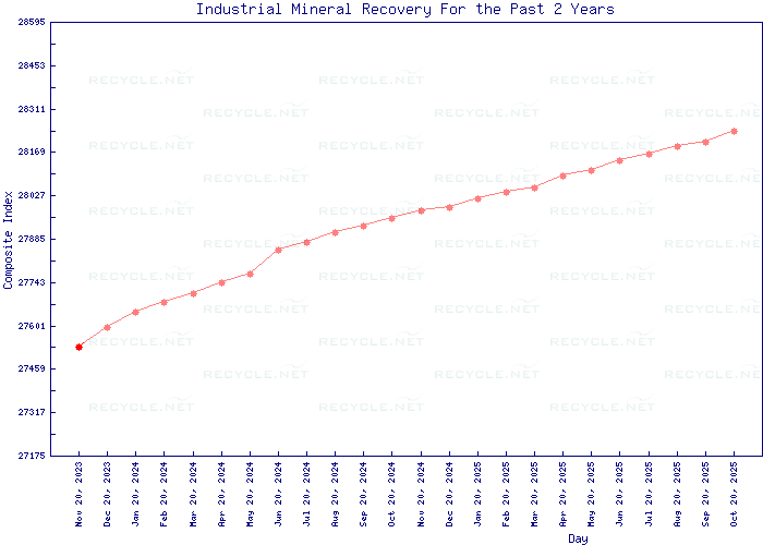 The Industrial Mineral Recovery Composite Index tracks the changing market prices if recovered minerals . The Index consists of a weighted basket of specific benchmark grades of recovered minerals and scrap industrial materials . The Index includes snapshots of 5 viewpoints of market trends : the past 7 days, past 30 days, past 90 days, past 1 year and past 2 years.