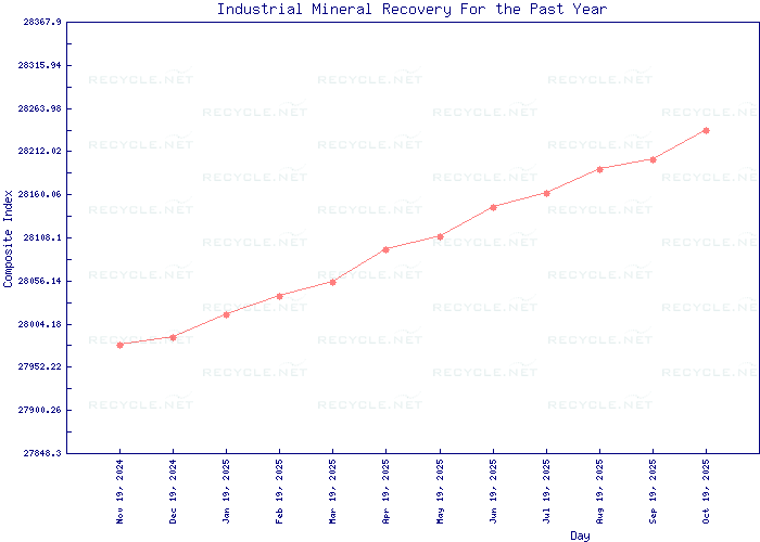 The Industrial Mineral Recovery Composite Index tracks the changing market prices if recovered minerals . The Index consists of a weighted basket of specific benchmark grades of recovered minerals and scrap industrial materials . The Index includes snapshots of 5 viewpoints of market trends : the past 7 days, past 30 days, past 90 days, past 1 year and past 2 years.